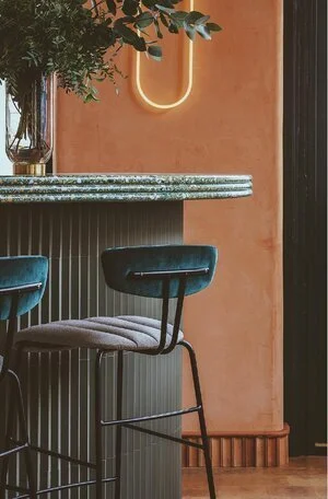 The peach and teal hues, are powerful colours used in an effortless way, immediately capturing the diners presence. In a similar way to the red and green ingredients, typically found in the Mediterranean dishes, as a focal point of their dishes.